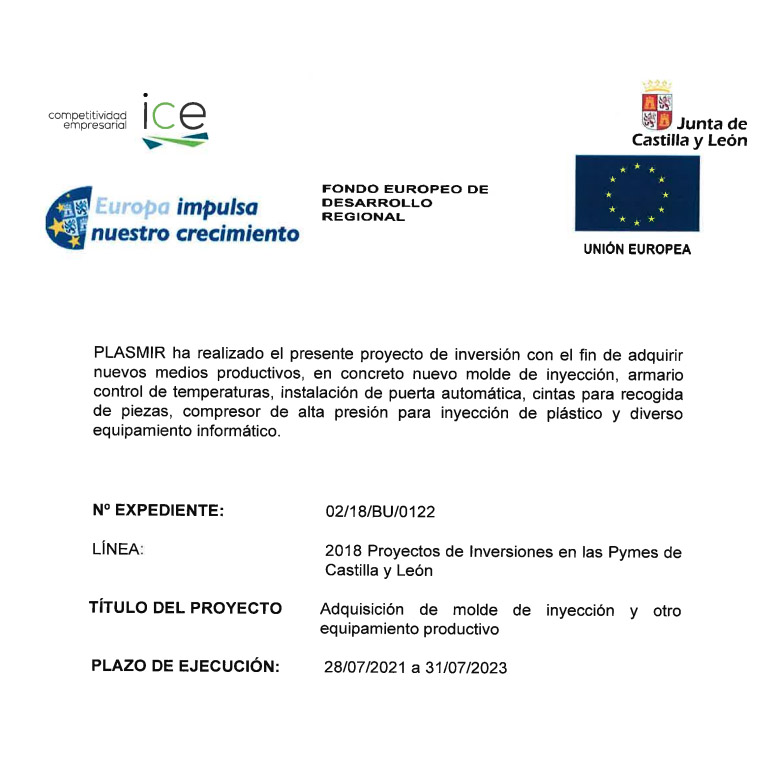 PLASMIR ha realizado el presente proyecto de inversión con el fin de adquirir nuevos medios productivos con el fin de avanzar en la fabricación de nuevos productos y mejorar la calidad de los mismos.