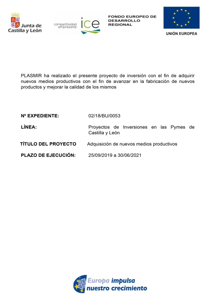 PLASMIR ha realizado el presente proyecto de inversión con el fin de adquirir nuevos medios productivos con el fin de avanzar en la fabricación de nuevos productos y mejorar la calidad de los mismos.